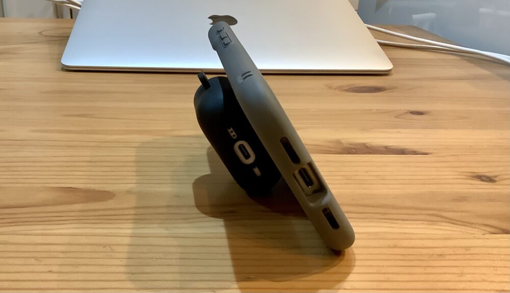 iPhoneとAirPodsを取り出して、イヤホンを耳に付けたらケースはiPhoneの背面に、動画視聴が捗りますよ!