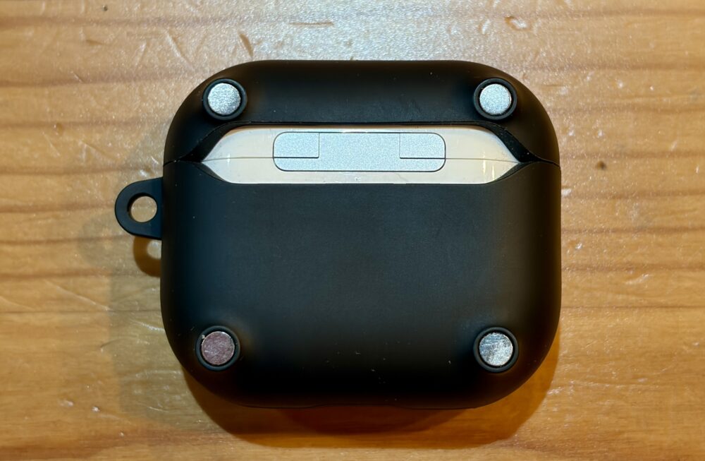 このシリコンゴムは割と硬めでヤワな印象は全くありません。なのでカバンなどに雑に放り込んでAirPods本体が傷つく心配から解放されます。