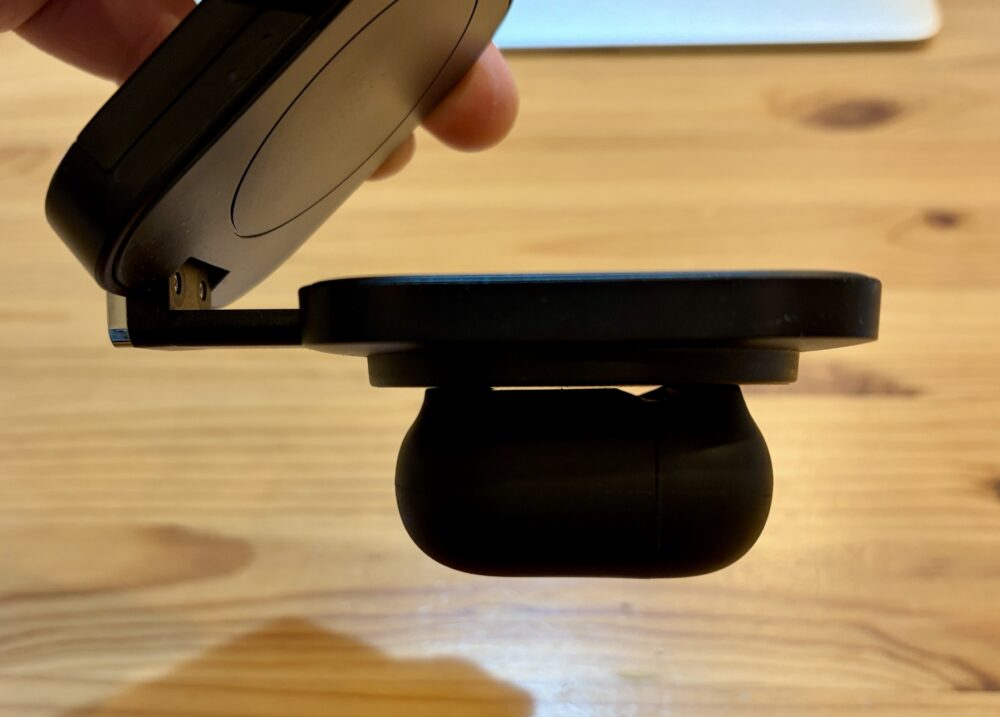 AirPods 4はワイヤレス充電対応ですが、置く位置がずれてしまうと充電できません。また、MagSafe充電器を使う場合普通iPhoneを貼ることが前提なので、斜めに火tらむいていることが多いと思います。なのでこの状態だとAirPods 4充電できないのです。